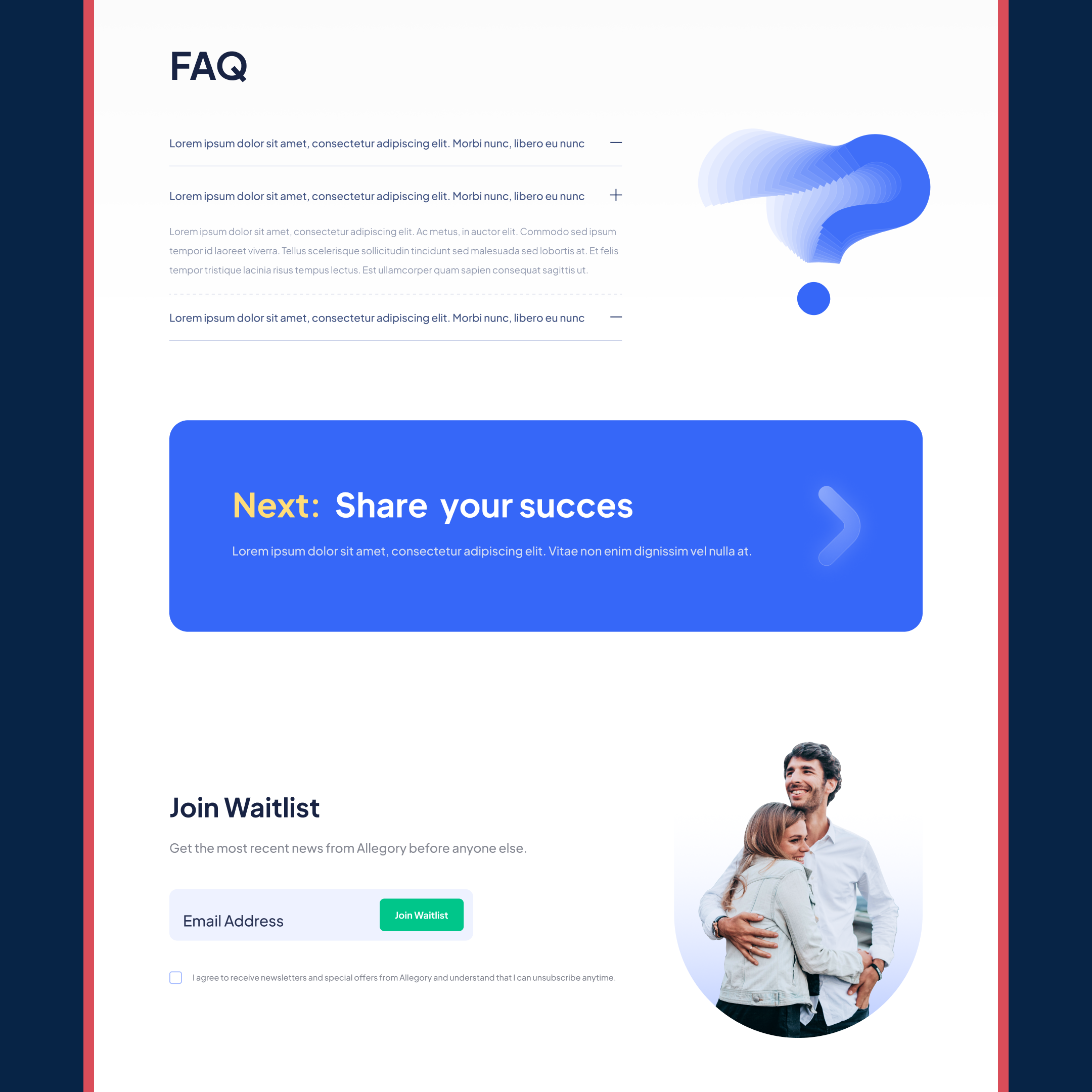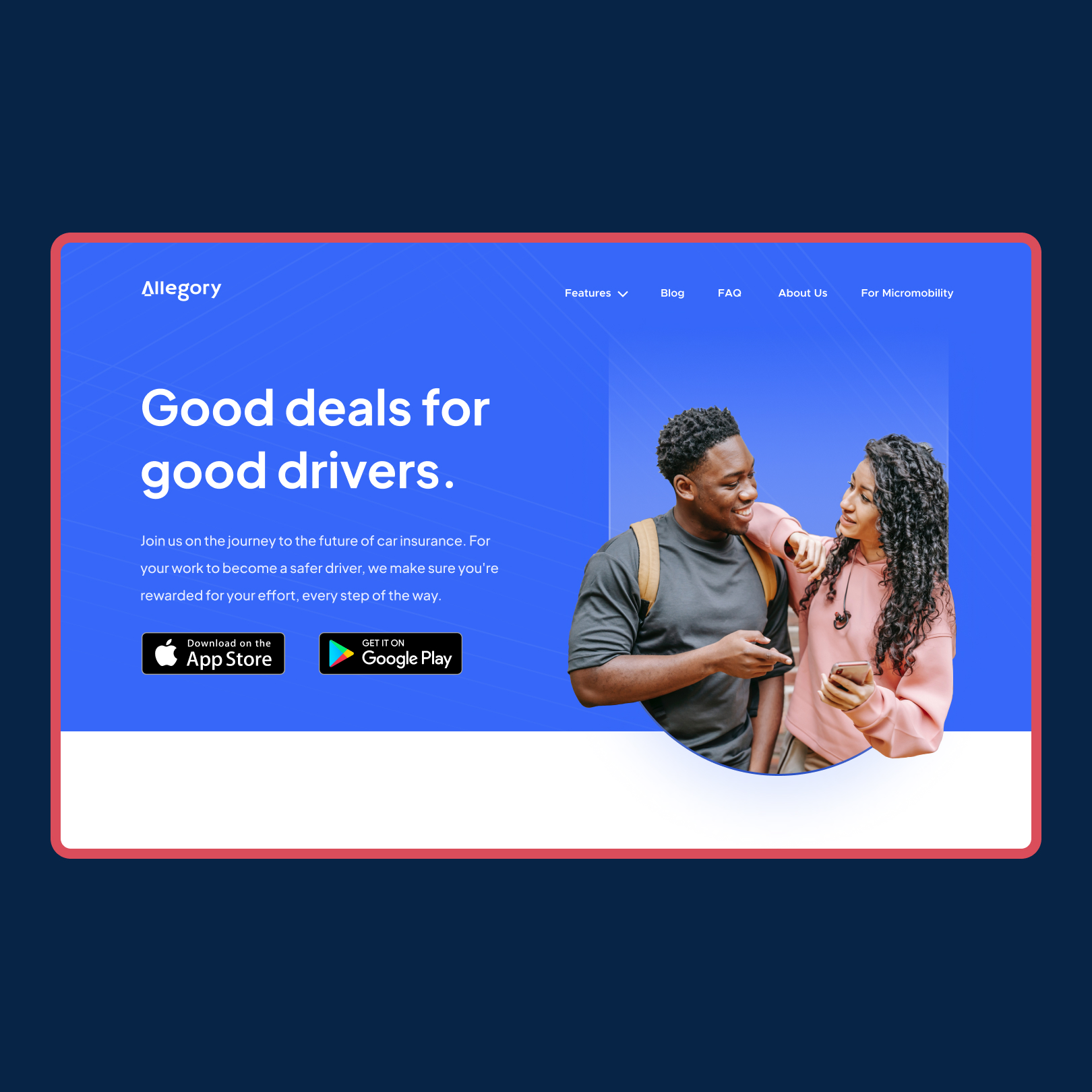 After designing the mobile app, I led the website design process, focusing on introducing Allegory and its benefits to potential users. For the UI, I used clean, subtle explanations to guide the design. In terms of art direction, I chose warm, positive images of smiling people to motivate users and convey the value Allegory can bring to their daily lives.